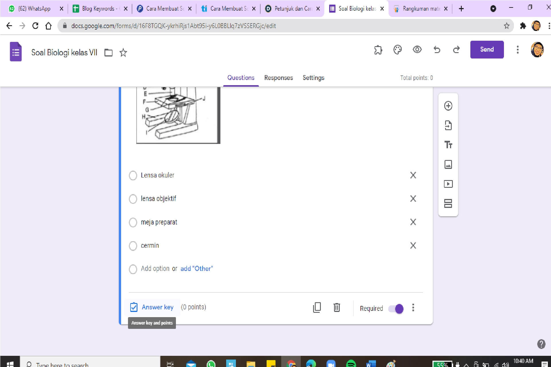 Pada Google formulir kuis ini Guru Pintar dapat membuat kunci jawaban untuk setiap jenis soal baiku itu jawaban singkat, pilihan ganda, kotak centang, dropdown, ubin pilihan, ubin kotak centang dan lain-lain. Klik bagian kiri bawah pertanyaan yang bertuliskan “Kunci jawaban” atau answer key.