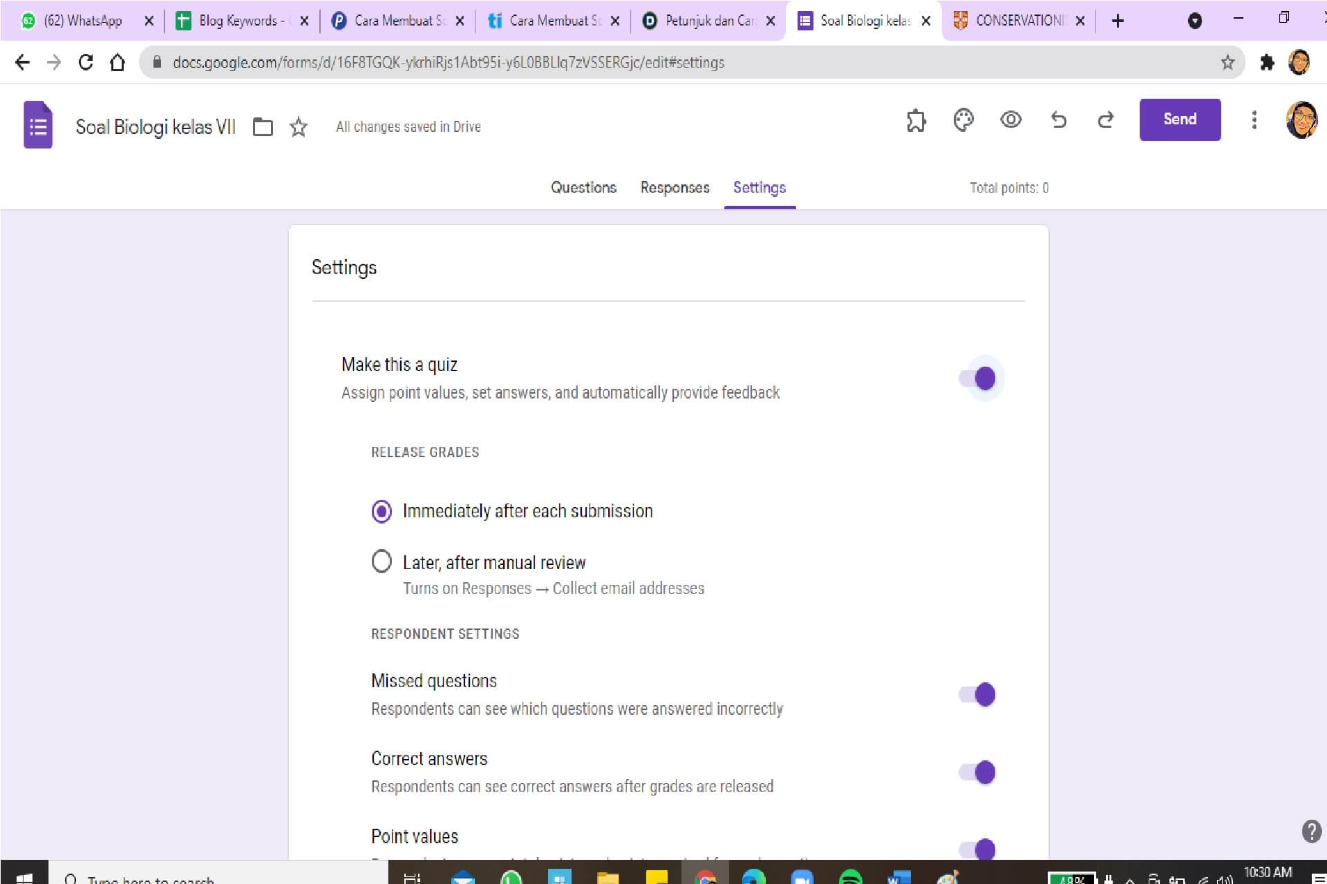 Dalam latihan soal google form, Guru Pintar dapat memilih apakah siswa-siswa dapat melihat pertanyaan yang belum terjawab, jawaban yang benar dan skor dari pertanyaan tersebut. Caranya adalah klik Pengaturan/settings. Lalu Klik kuis/quiz. Di bagian “Responden dapat melihat”/respondent settings, Guru Pintar tinggal menggeser bulet hingga berwarna ungu pada item mana saja yang dapat dilihat oleh siswa.